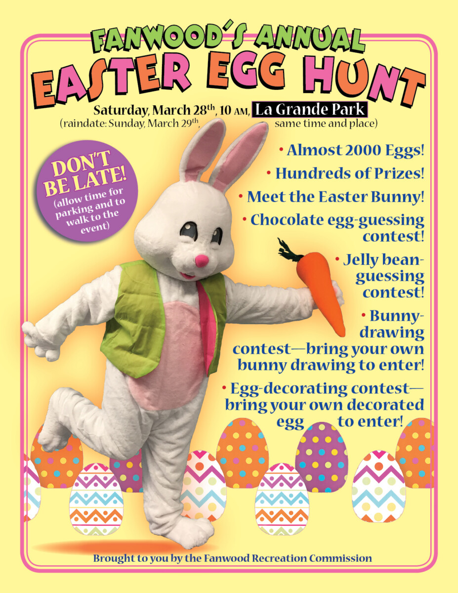 Fanwood's Annual Easter Egg Hunt will be held on Saturday, March 28 at 10 am sharp. Make sure you get there early to ensure ...