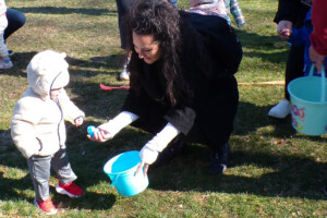 Mom helps her child grab an Easter egg.