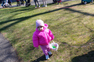 The playground was divided by age into five different egg hunt areas with each hunt taking less than a minute as children scrambled to fill their baskets with as many eggs as possible. Each egg contained candy or a prize. The hundreds of plastic eggs were filled by Recreation Commission volunteers.