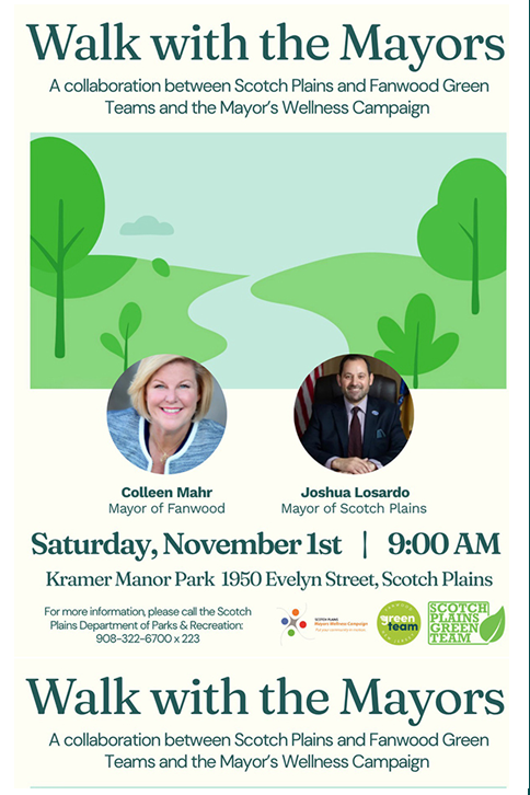 Join the Mayors of Scotch Plains and Fanwood, along with the Green Teams and the Mayor’s Wellness Campaign, for a community walk on Saturday, November 1 at 9:00 AM at Kramer Manor Park in Scotch Plains.